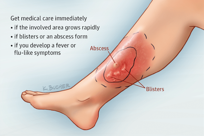 Cellulitis can be triggered by an open wound, animal bite, infected surgical site, skin breaks due to eczema or athlete’s foot, IV drug use. If you do have an open wound or skin break that is at risk for infection, it is best to keep that area clean and dry. The CDC recommends avoiding hot tubs, beaches/rivers/lakes, and swimming pools if you do have an open wound.
